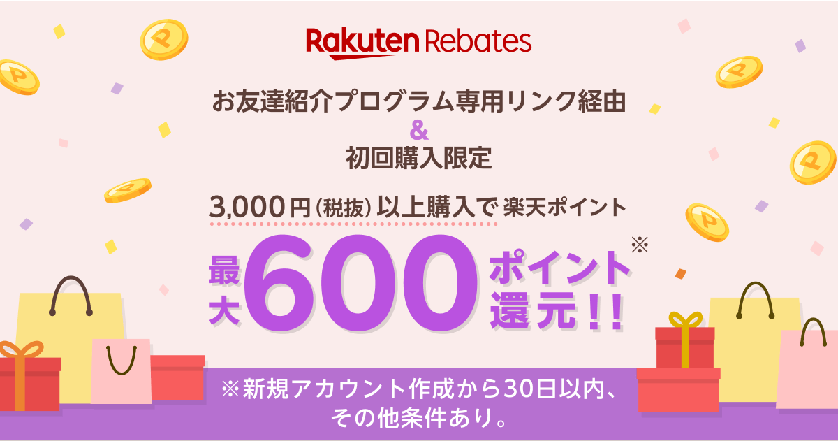 もしまだ楽天リーベイツのアカウントを持っていない方は、こちらの紹介リンクから登録して3,000円以上お買い物をすると、さらに500ポイントのボーナスがもらえます。